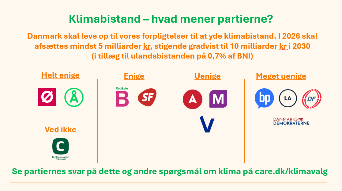 Danmark skal leve op til vores internationale klimaforpligtelser. Klimabistand er både solidaritet og sikkerhedspolitik, fordi den hjælper lande med grøn omstilling og klimatilpasning og kan forebygge ustabilitet, konflikter og kriser. Pengene skal bruges klogt og give dokumenterbare resultater, med klare mål, åben rapportering og fokus på effekt. Derfor er klimabistand en integreret del af udviklingsbistanden, fordi klimaindsatsen er en forudsætning for bæredygtig udvikling.