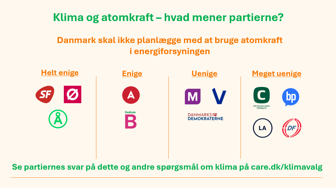 Danmark har brug for billig, sikker og grøn energi. Det kan sol og vind give. Hvis de nye atomkraftteknologier på et tidspunkt i fremtiden viser sig at være både lige så billige og hurtige som sol og vind, så er vi åbne overfor at drøfte atomkraft i Danmark. Vi mener dog ikke, at Danmark for nuværende skal planlægge med at bruge atomkraft.