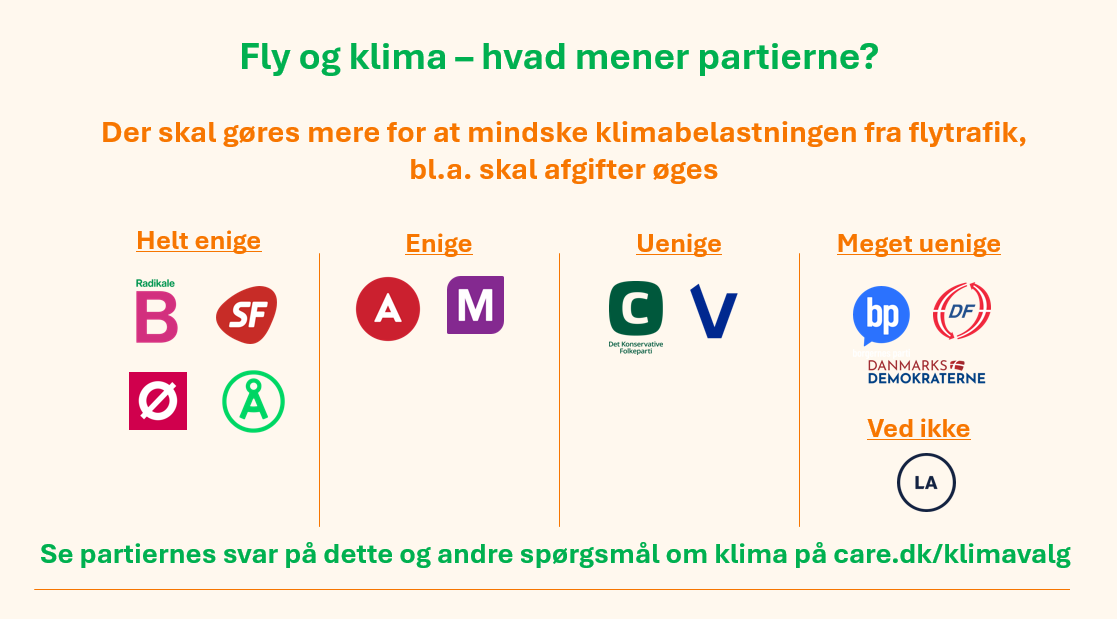 Udledningen fra fly udgør en betydelig del af den globale klimabelastning. Derfor skal vi gøre mere for at omstille luftfarten fx med grønne brændstoffer, som vi har arbejdet for herhjemme. Samtidig er brugen af privatfly steget de seneste år og er fritaget fra en passagerafgift. Det kunne være man skulle starte med at sætte en afgift på privatfly, før man gør det dyrere for de almindelige danskere at flyve.