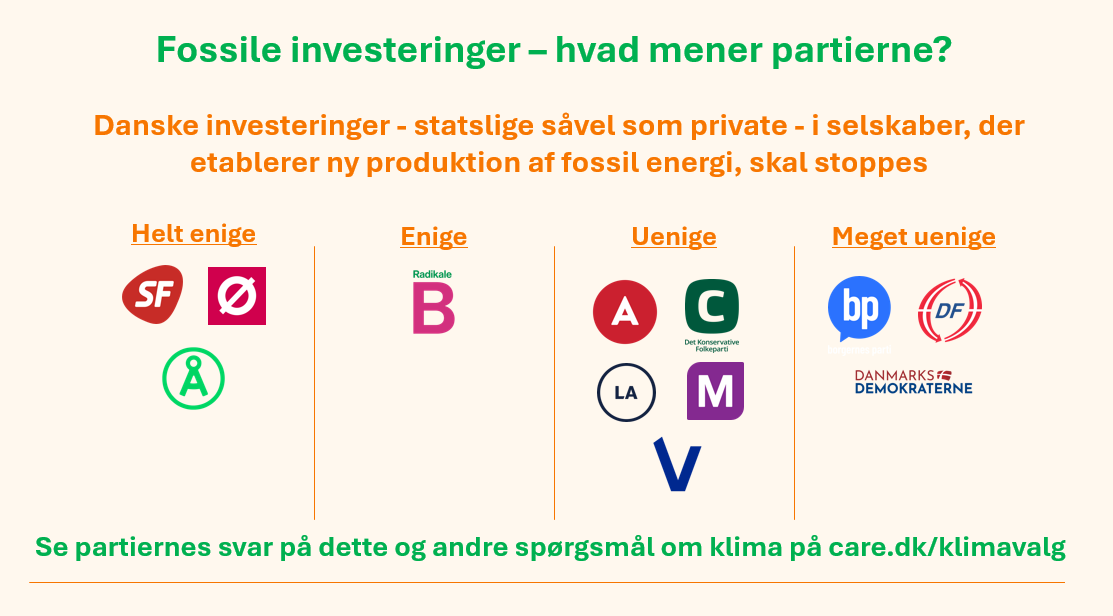 Danske investeringer - statslige såvel som private - i selskaber, der etablerer ny produktion af fossil energi, skal stoppes.